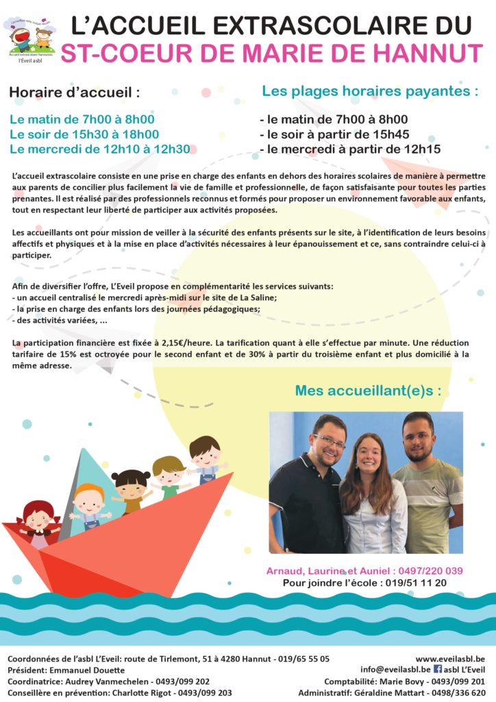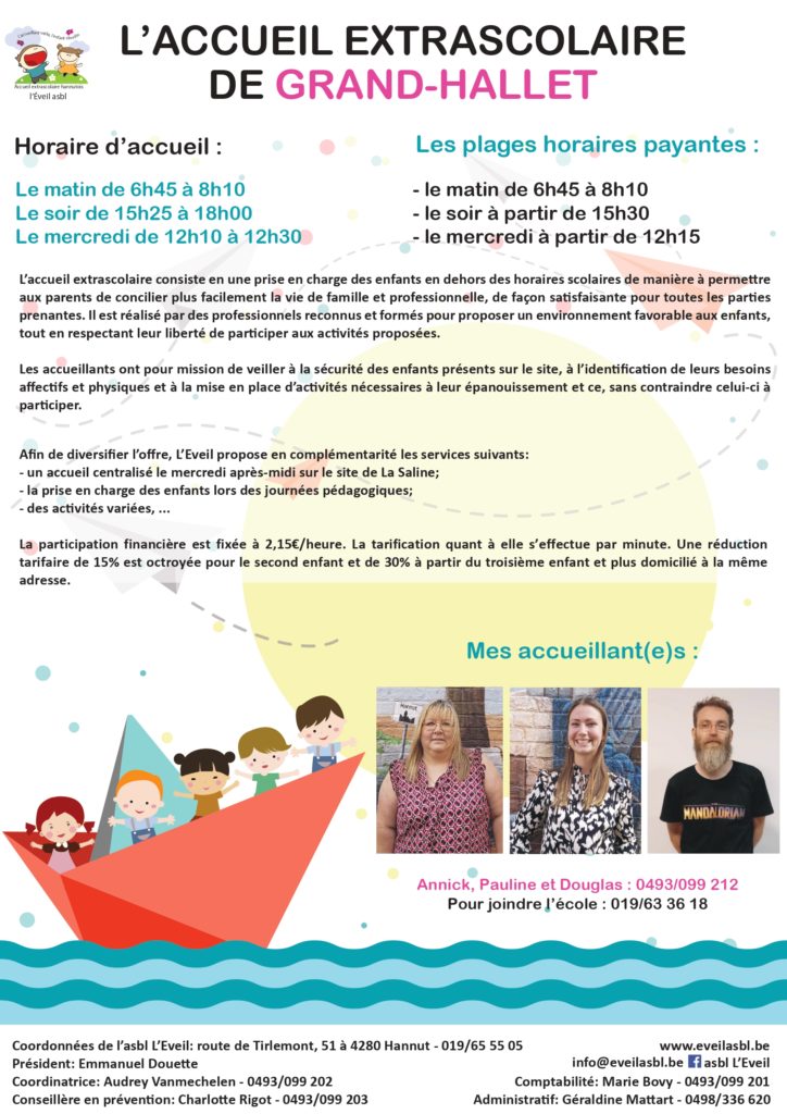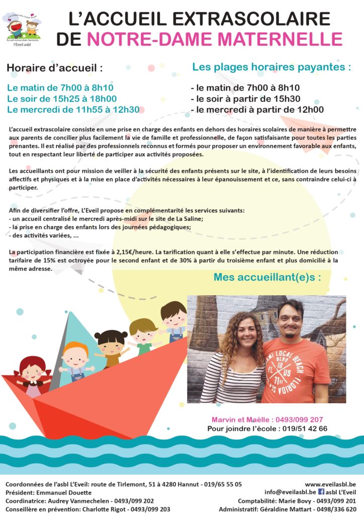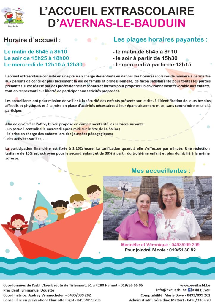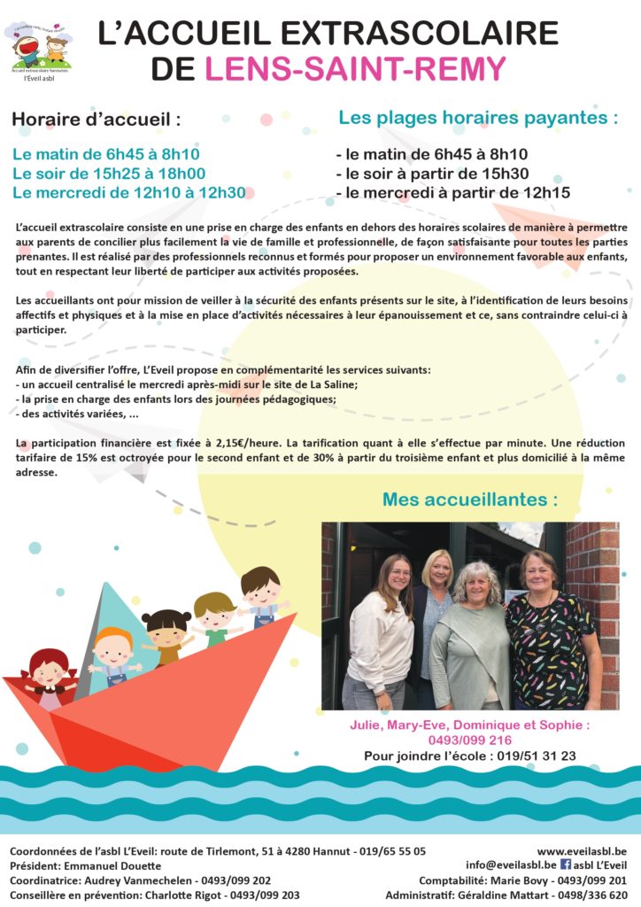 Sur le principe, tout enfant présent dans l’enceinte de l’école après et avant les heures scolaires est sous la responsabilité de l’asbl l’Eveil.