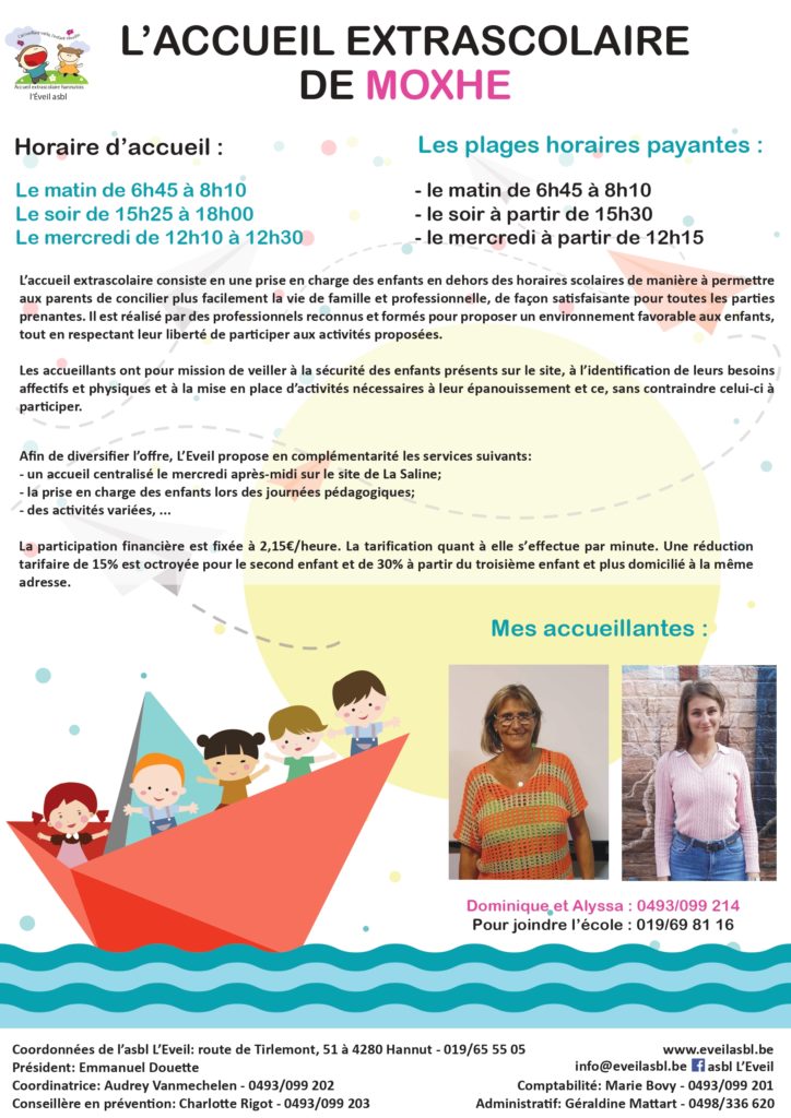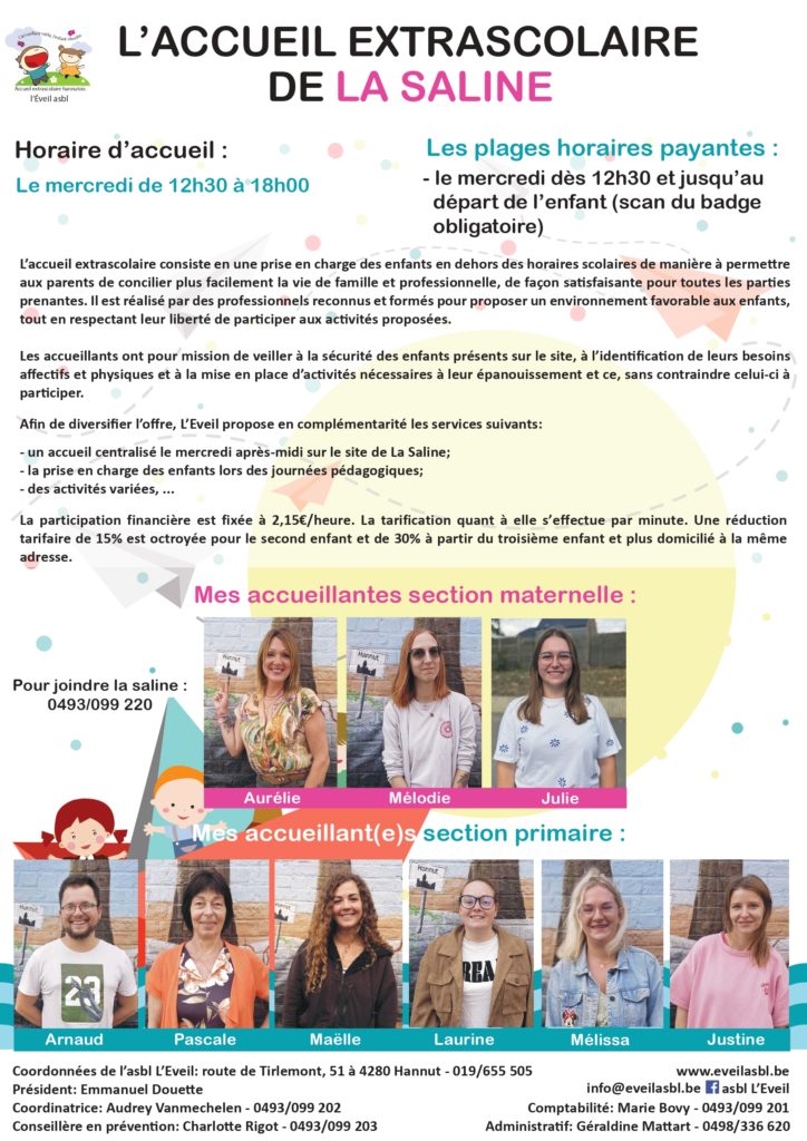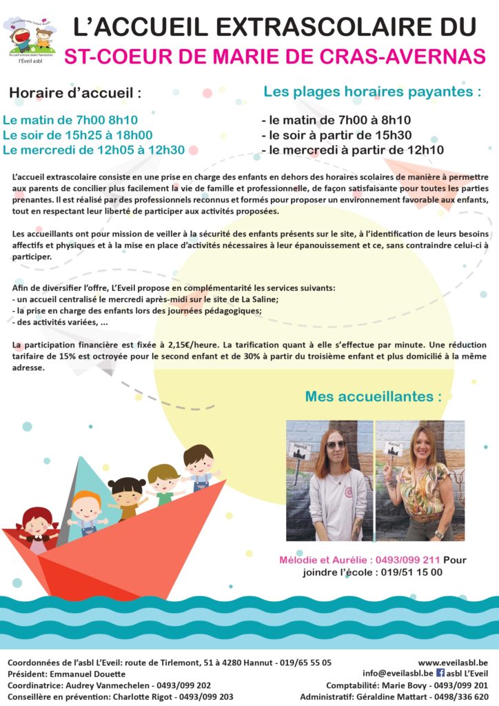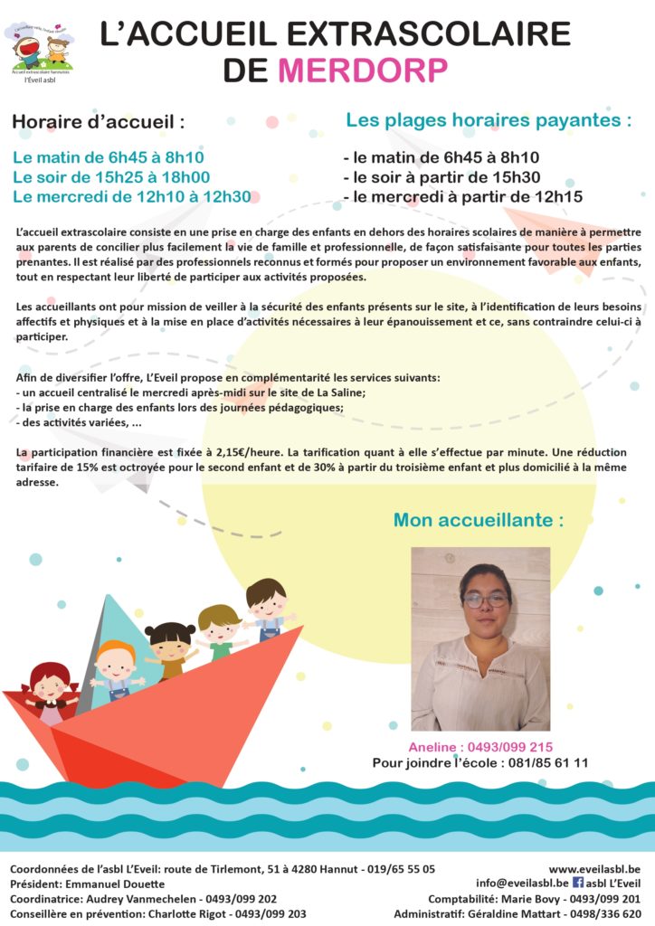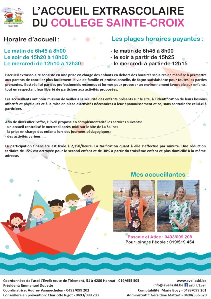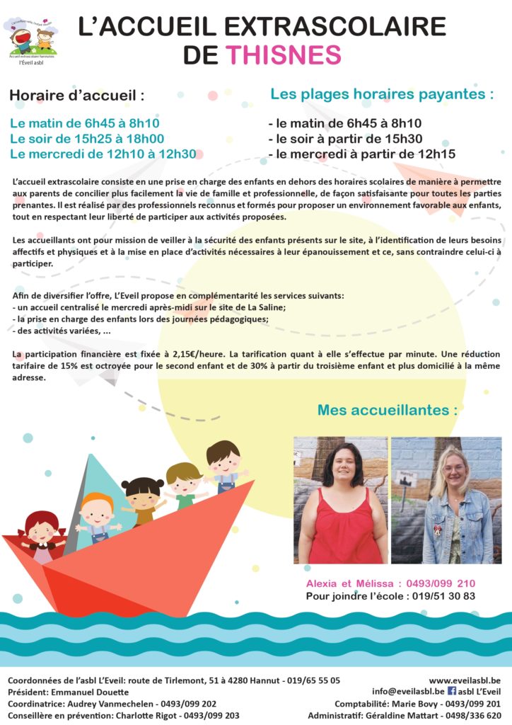 Sur le principe, tout enfant présent dans l’enceinte de l’école après et avant les heures scolaires est sous la responsabilité de l’asbl l’Eveil.